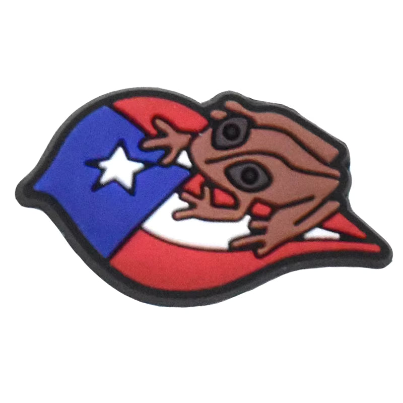 Un coquí sobre una hoja decorada con los colores de la bandera de Puerto Rico, simbolizando la naturaleza y la identidad isleña. Ideal para decorar tus Crocs o zapatos similares con un toque auténtico y cultural.