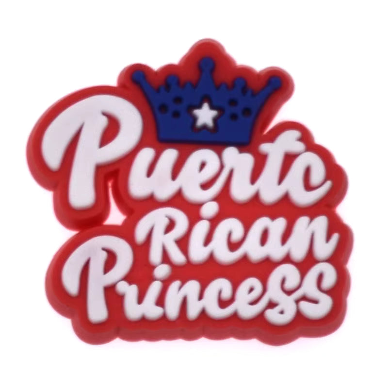 La frase “Puerto Rican Princess” acompañada de una corona, celebrando el orgullo y la fuerza de la mujer boricua. Ideal para decorar tus Crocs o zapatos similares con estilo y empoderamiento.