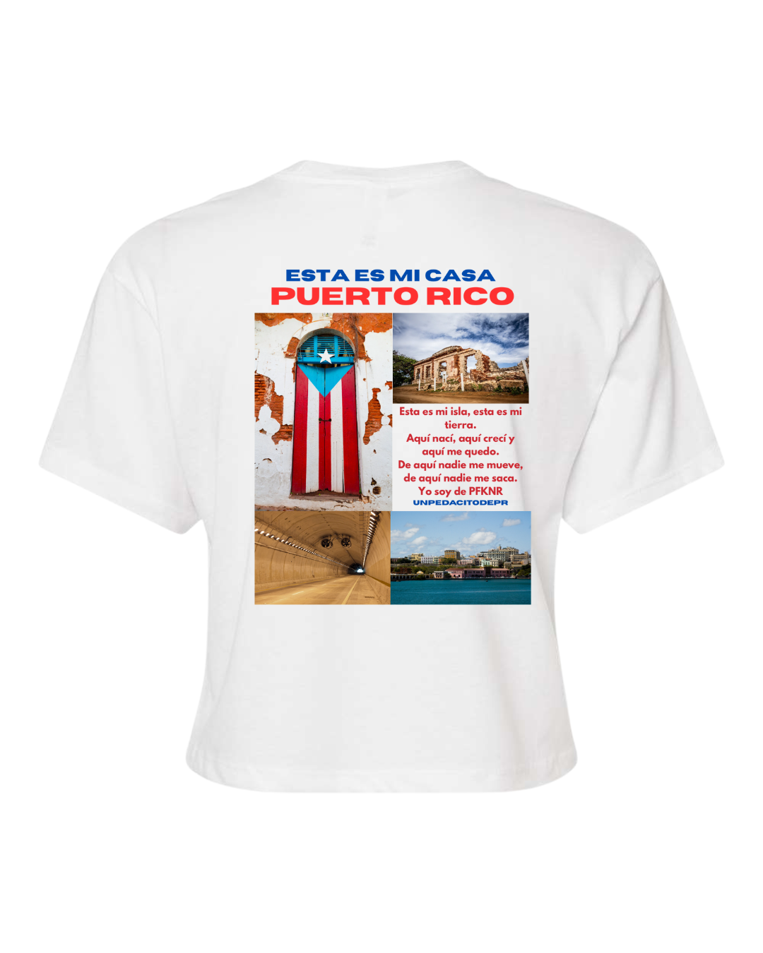Esta crop top combina diseño moderno con un poderoso mensaje cultural, haciendo una declaración de identidad con flow boricua. Al frente, lleva la frase “Pe erre”. En la parte trasera, una composición visual con imágenes icónicas de la isla y el mensaje “Esta es mi casa – Puerto Rico” rinde homenaje a nuestras raíces.
