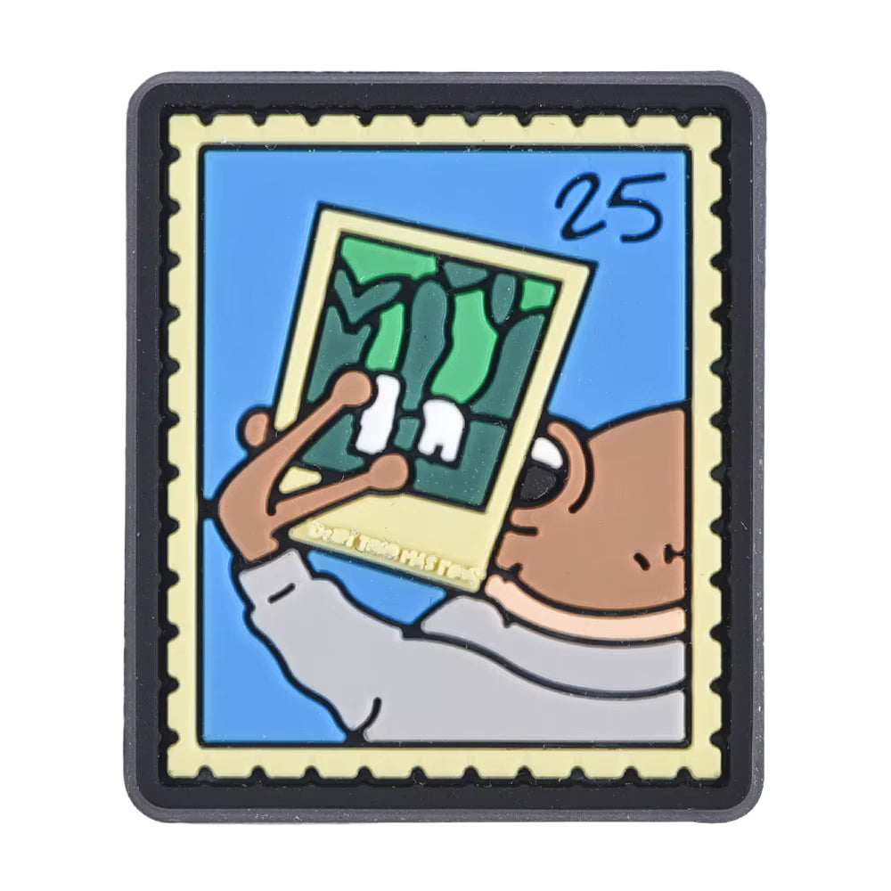 Un diseño en forma de sello postal con concho sosteniendo una foto, combinando creatividad y esencia boricua en un accesorio único. Ideal para decorar tus Crocs o zapatos similares con un detalle divertido y cultural.